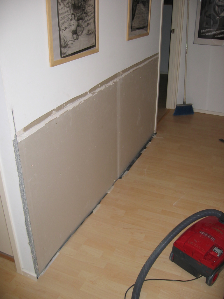 hall wall minus old plasterboard hall wall new board hall wall first filler