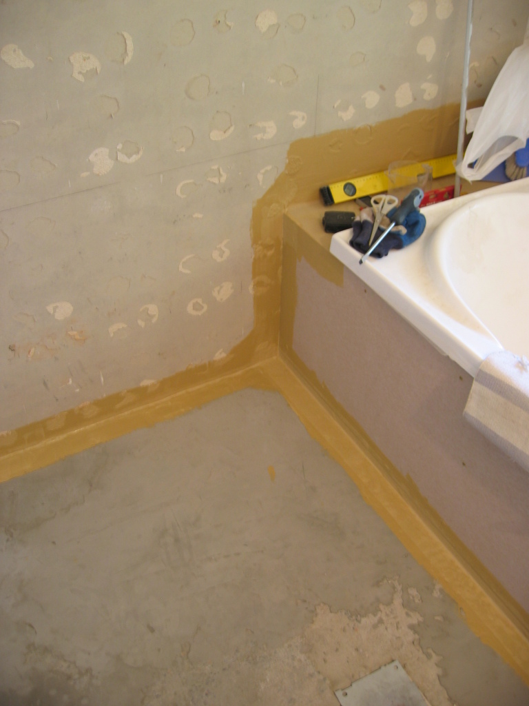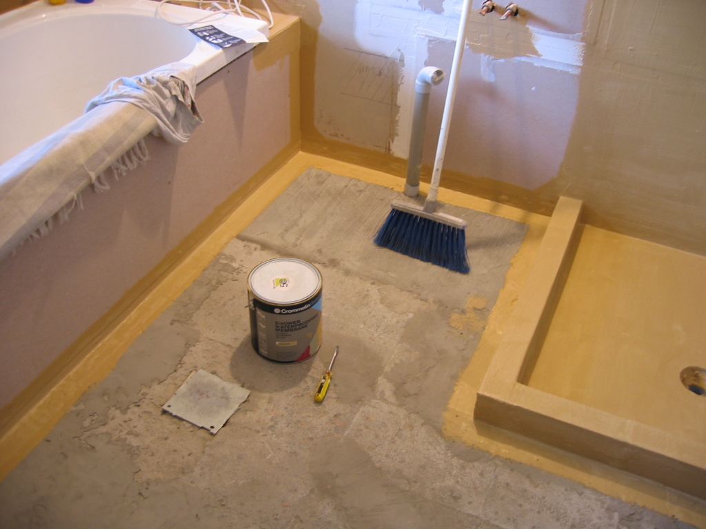 After some more farting around with floor leveller I have declared the floor surface "good enough" (it's going to be tiled over anyway) and put in more waterproofing, which - while also a gooey mess - is a substance much more to my liking.