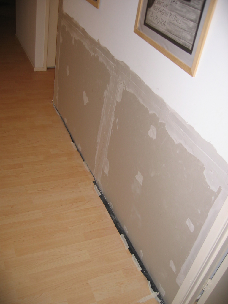 After that I took care of the (hopefully) last bit of messy work - fixing the plasterboard of the bathroom-hallway wall on the hallway side. This was a super-straightforward exercise of ripping the old stuff off (less straightforward: deciding on the go that doing the whole wall is better than just doing some smaller panel), screwing on the new stuff and plastering the joints. The last is still in progress because I happened to buy the "fine" filler, which I shouldn't have because it shrinks a lot.